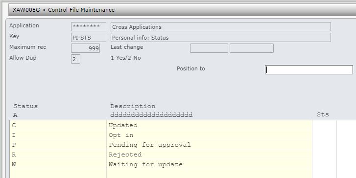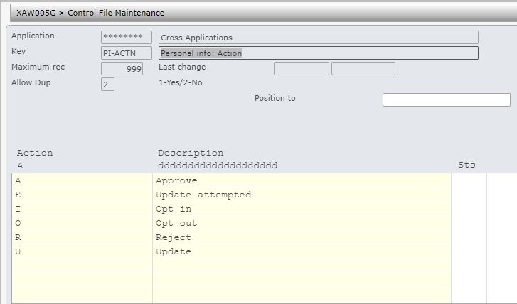 Requests for PI removal can be set to pend for approval. This can be set by entity type in this control file. If a request has failed to update it can be set to pend again or remain at ‘W’ status for next update.