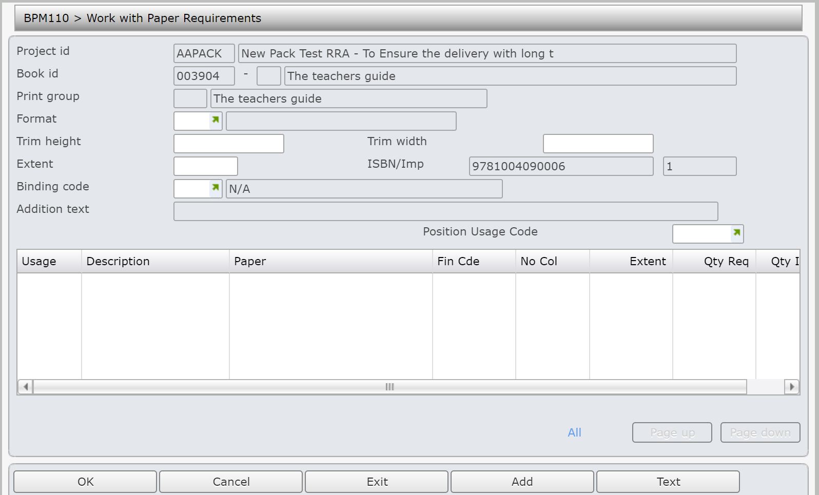 - Select the book specifications and click option Mtrl/Rntl. BPM110 Work with Paper Requirements is displayed.