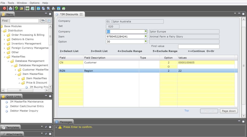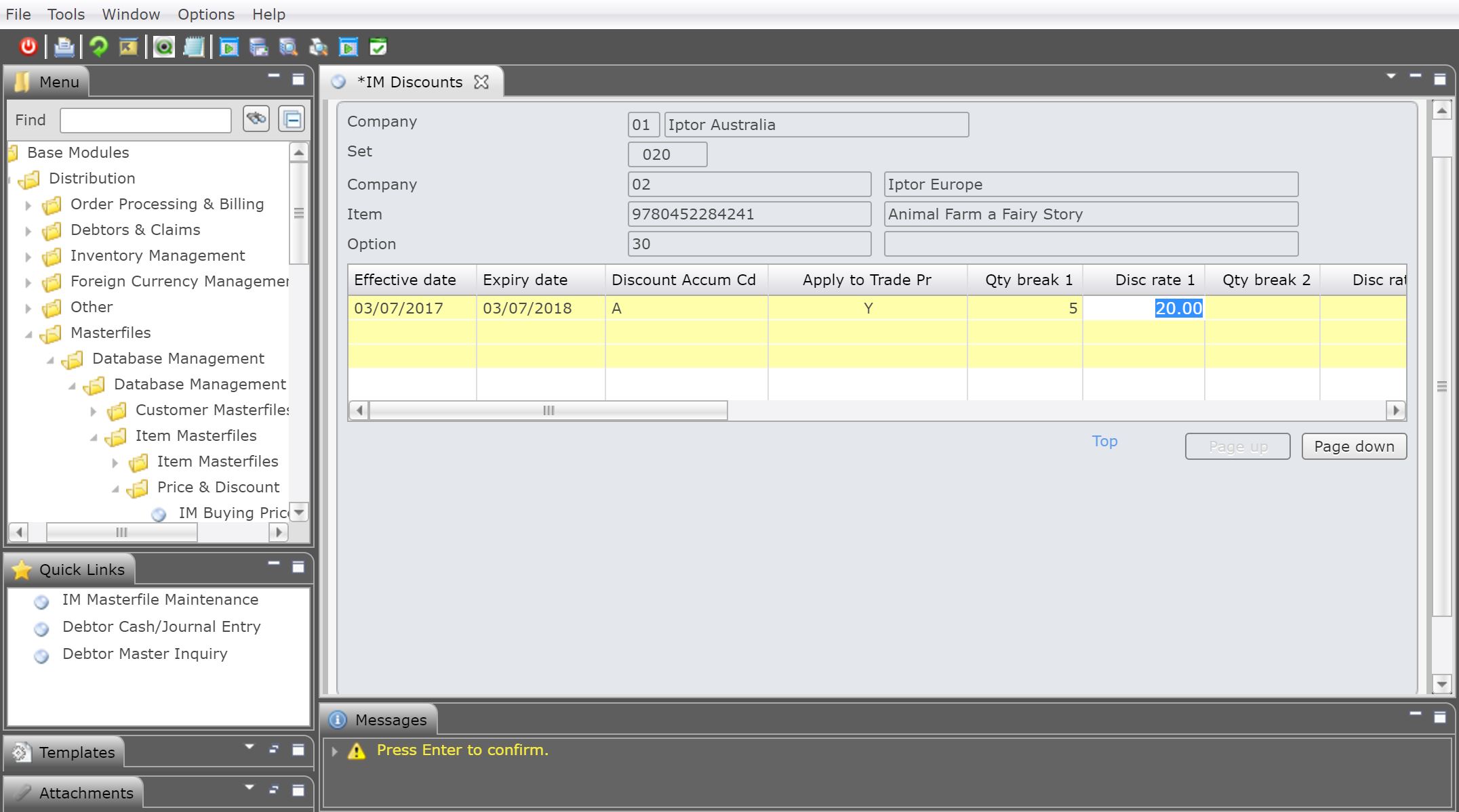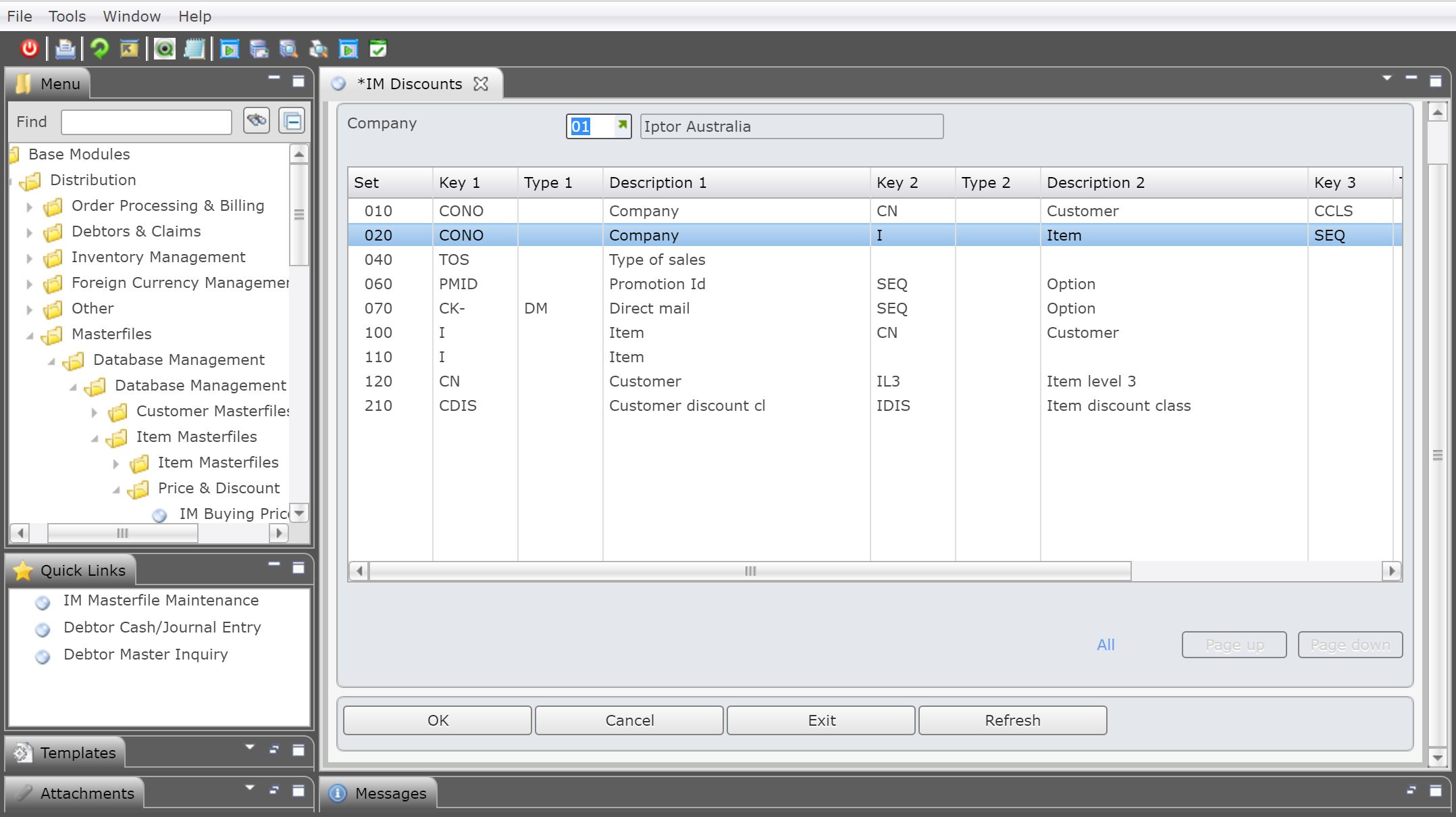 - In the menu, expand Base Modules > Distribution > Masterfiles >Database Management > Database Management > Item Masterfiles > Price & Discount and double-click IM Discounts. DSM033 Work with Discounts panel displays the discount matrix set. The set sequence is maintained in control file TMSDS/SEQ-IDIS.