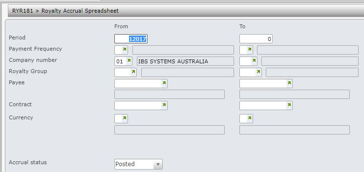 - In the menu, expand Publishing Modules > Rights & Permission > Period Processing and Others > Monthly Royalty Run and double-click Royalty Accrual Report E-report. RYR181 Royalty Accruals Report panel appears.