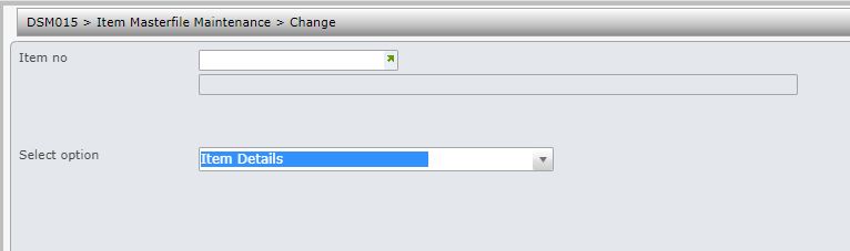 - Select option Item Fields from list of select options. DSM015 Work with Item Fields main panel is displayed.