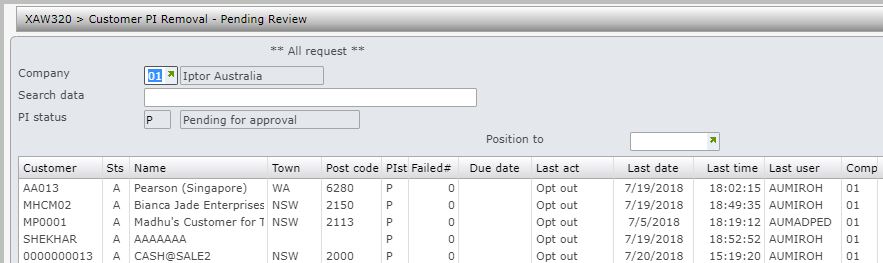 - To review customer requests, expand menu Customer and double-click Customer PI Pending Review. XAW320 Customer PI – Pending Review panel appears.