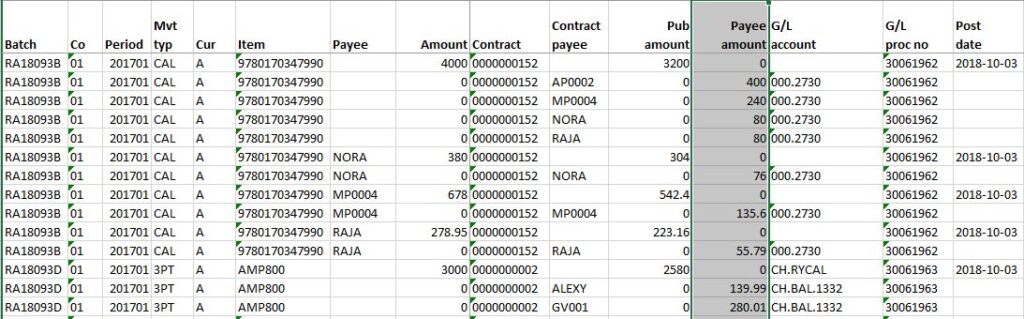 The Copyright Agency License (CAL) report shows the details of the uploaded CAL file along with the calculated payee and the publisher pay amounts. Report sequence is by batch number by company by movement type. The program generates an excel spreadsheet that is stored in the network directory specified in the document exchange system.