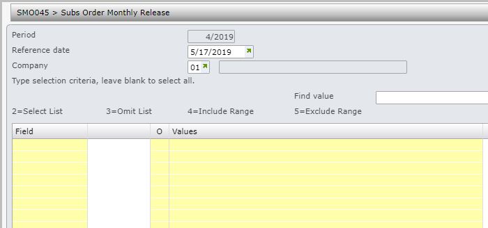 - In the menu, expand Publishing Modules > Subscriptions Management > Subs Release/Renewal and then double-click Subs order Monthly Release. SMO045 Subs Order Monthly Release panel appears.