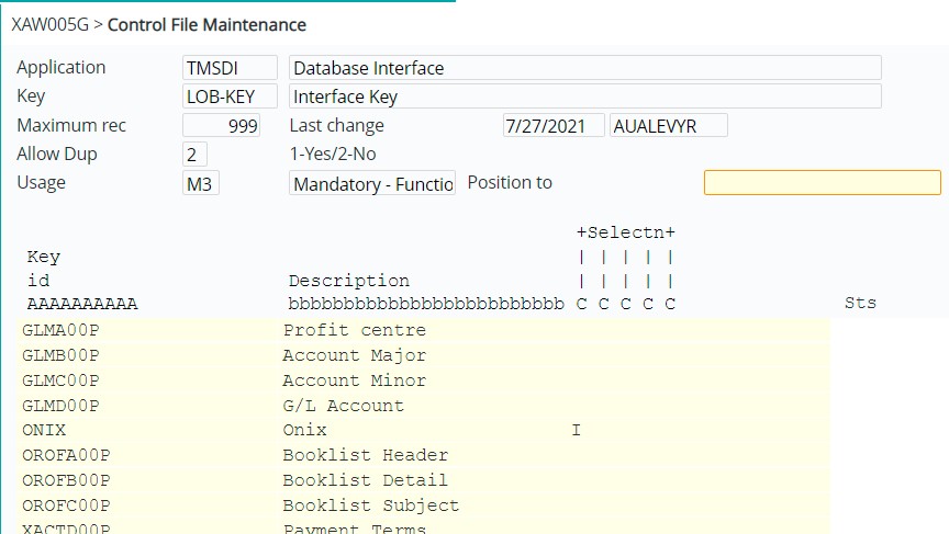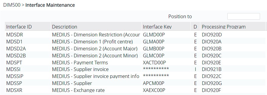 | Interface key | This is the interface key as defined in TMSDI/LOB-KEY for the database relationship. The interface key is used to trigger the interface from IP1 to Medius and should only be setup for those interfaces that require triggers to interface. |
