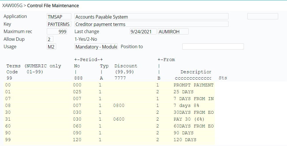 - Update TMSAP/PAYTERMS with any early payment discounts