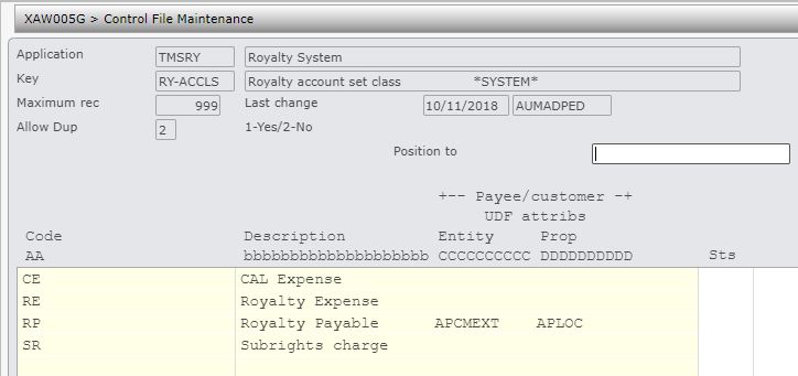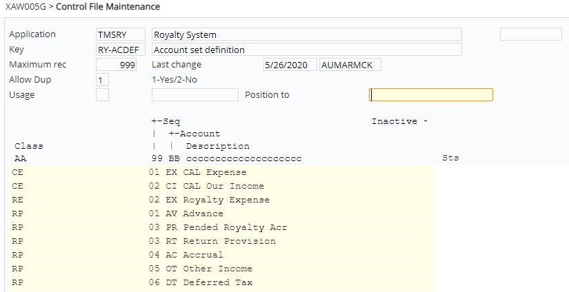 | TMSRY/RY-ACCLS Royalty account set class | This is a system defined control file to classify the royalty account set into expense group and payee group. |