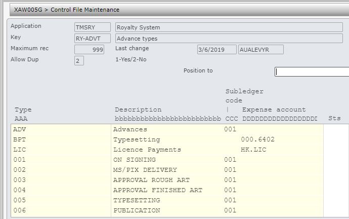 | TMSRY/RY-ADVT Advance types | Maintain all the different types of advances that may apply to Royalties. |