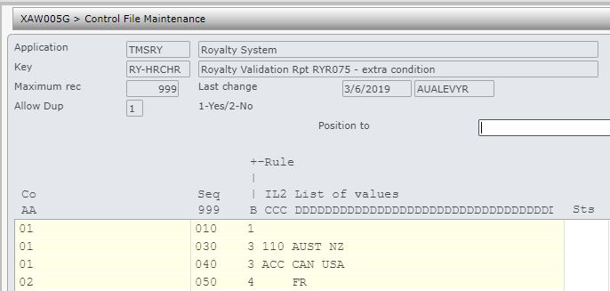 | TMSRY/UA-ACC User access – applicable accounts | Royalty user access has been changed to remove the Items levels and add Company group and Royalty group. All royalty processes are controlled by user access in TMSRY/UA-ACC and TMSRY/UA-ACT. |