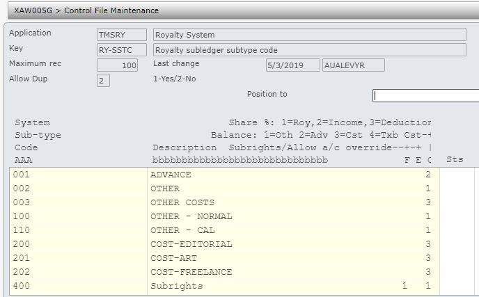 | TMSRY/RY-SSTC Royalty subledger subtype code | Add subledger sub- type codes. |