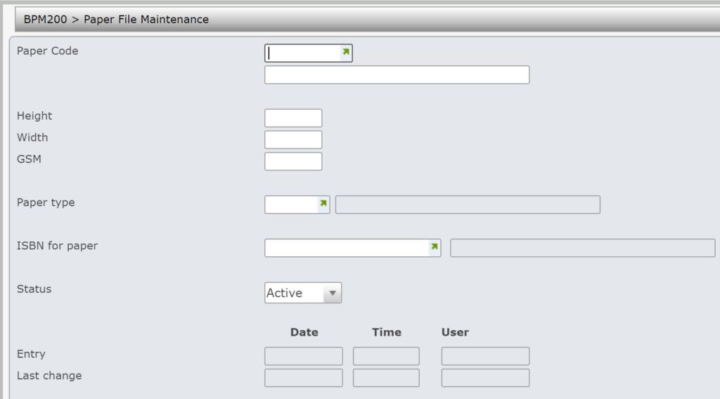 - In the menu, expand Publishing Modules > Book Publishing > Others > Paper Control > Maintenance and double-click BP Work with Paper. BPM200 Work with Paper main panel is displayed.