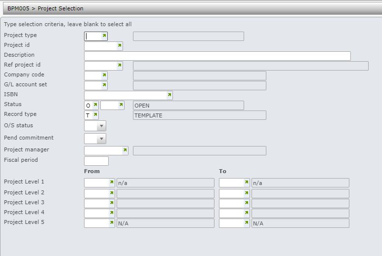 - In the menu, expand Publishing Modules > Book Publishing >Templates and double-click BP Work with Template. BPM005 – Project Selection main panel appears. Field Record type defaults to T (for templates).