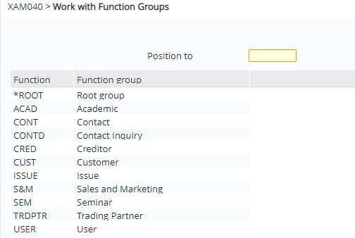 Function groups are simply used to tie different CRM options (programs) together into groups, thus determining what tabs/selections are available to you from each CRM option (assuming your user profile has access to them also – see Work with CRM User Options).