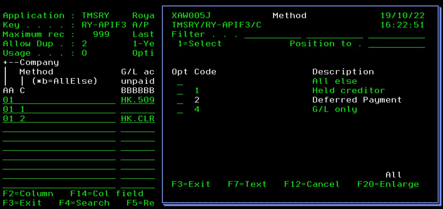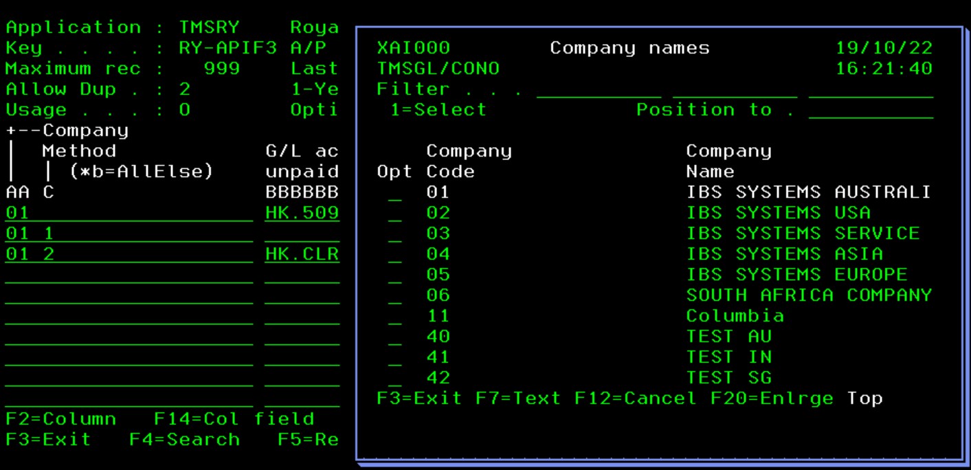 - Select the control file TMSRY/RY-APIF3 and press F14=Col field on column A (Company). The validation on column A is control file TMSGL/CONO, so the following screen will display which you can maintain if required,