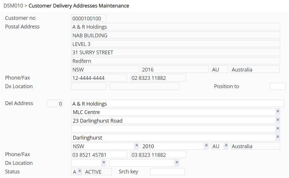 This is the address where the goods ordered by this customer are delivered. Each customer can have up to 999 different delivery addresses. Apart from the primary delivery address, each subsequent delivery address is identified by a three digit number and one of these addresses can be nominated as the preferred delivery number. These codes are used for all future references to the delivery addresses.