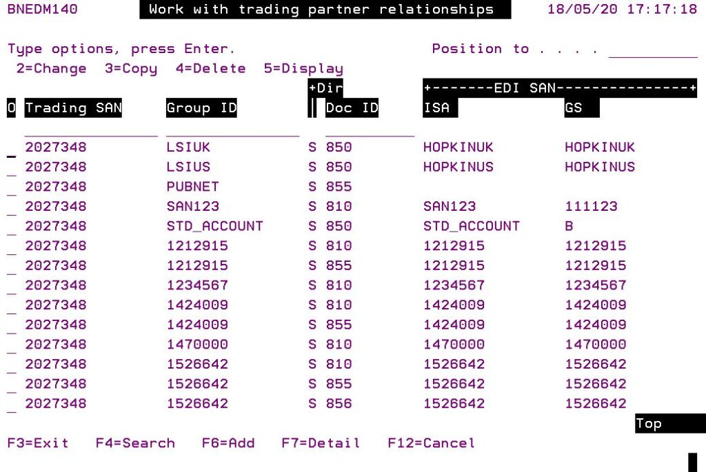 - In the menu, expand Other Modules > Other Regions > US Options > EDI and double-click Working with Trading Partner. BNEDM140 Work with Trading Partner Relationships panel appears listing all the existing relationships.