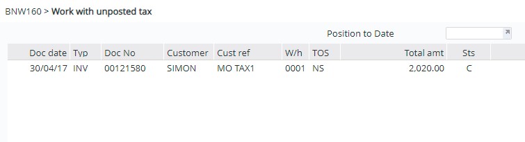 - Expand menu Other Modules > Other Regions > US Options > Other and double- click Work with Unposted Transactions (BNW160). List of unposted transactions appears. The listed transactions are already invoiced in IP1 with status C = Complete; with just the tax component awaiting to be posted and finalised in Avalara.