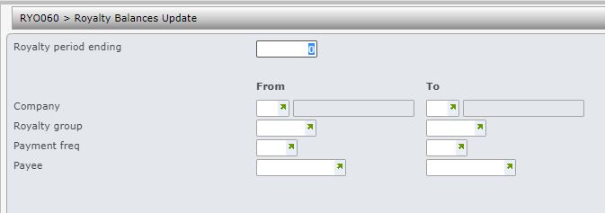 | Royalty period ending | Enter the Royalty period ending to specify for what period the balances are to be updated, |