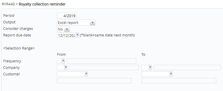 The Collection Reminders are for non receipt of licensee or 3rd party sales. Any paid transactions for royalties or fees are not included in this report. It is for reports not received by the publisher up until the current Royalty period. The report selection is by period, report due date, payment frequency, company and customer. You have the option to include charges and output to excel or the spool file. The defaults for these options are maintained in control file TMSRY/COL-LTRD. This report is also run as part of Collections Contracts EOM batch process for non-receipt sales analysis. Closed contracts and submission contracts are excluded in the reminder.