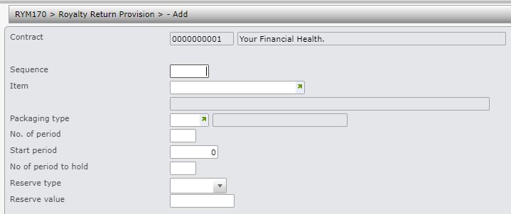 - Select the royalty contract and right click option Rtn prov. RYM170 Returns Provision Maintenance panel appears.